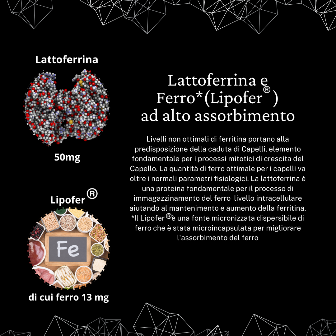 Il ferro è essenziale per la produzione di emoglobina, che trasporta ossigeno ai tessuti, inclusi i follicoli piliferi. La carenza di ferro è comunemente associata all'alopecia femminile. La Lattorferrina, una proteina del latte, mostra un'attività antimicrobica legando il ferro, sottraendolo dall'ambiente circostante e impedendo la proliferazione di batteri e virus ferro-dipendenti. Questo aiuta a mantenere un equilibrio del ferro nel corpo, evitando carenze che possono contribuire alla caduta dei capelli.