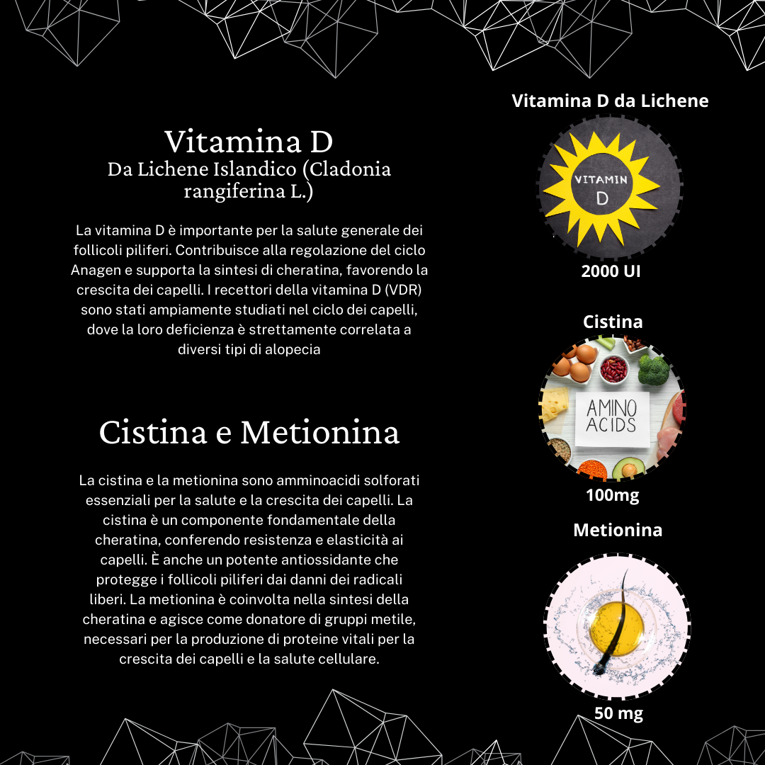La cistina e la metionina sono amminoacidi solforati essenziali per la salute e la crescita dei capelli. La cistina è un componente fondamentale della cheratina, conferendo resistenza e elasticità ai capelli. È anche un potente antiossidante che protegge i follicoli piliferi dai danni dei radicali liberi. La metionina è coinvolta nella sintesi della cheratina e agisce come donatore di gruppi metile, necessari per la produzione di proteine vitali per la crescita dei capelli e la salute cellulare.