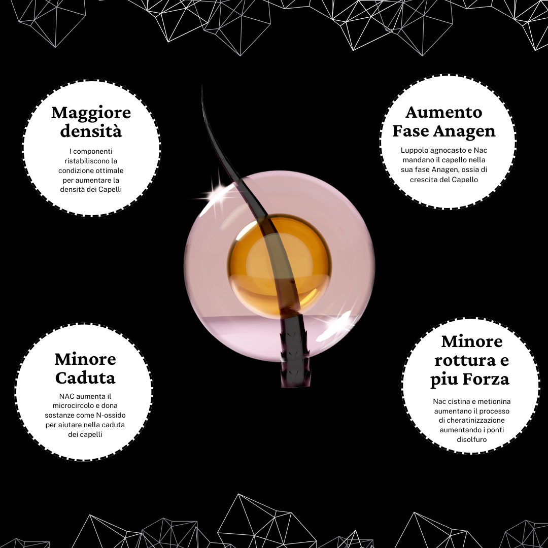 Il luppolo agisce come fitoestrogeno, particolarmente importante nell'alopecia femminile estrone carenziale, dove un deficit di estrogeni a livello del follicolo pilifero può causare caduta dei capelli. L'Agnocasto agisce come progestinico naturale, modulando la regolazione neuroendocrina attraverso l'aumento del rilascio di ormone luteinizzante (LH) e l'inibizione della prolattina, nonché attraverso l'attivazione dell'aromatasi, enzima che converte gli androgeni in estrogeni. Questo meccanismo aiuta ad attivare la fase Anagen del ciclo dei capelli, promuovendo la crescita dei follicoli piliferi.