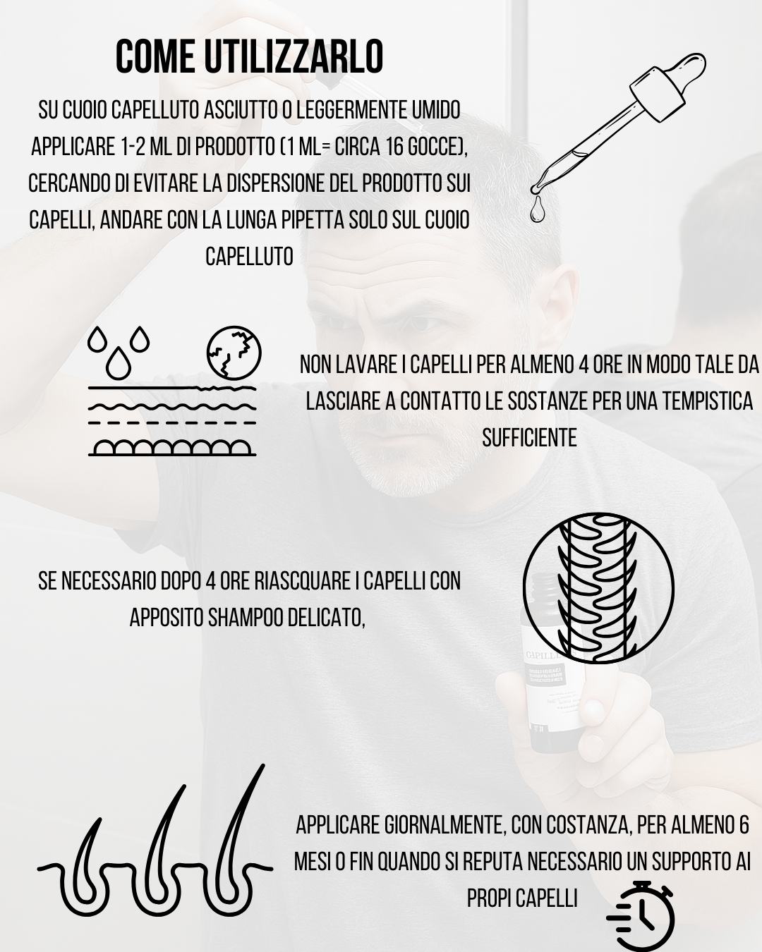 Applicare 1–2 ml (16 gocce circa) direttamente sul cuoio capelluto asciutto o leggermente umido, una volta al giorno, preferibilmente la sera. Massaggiare delicatamente fino a completo assorbimento. Non risciacquare per almeno 5 ore.